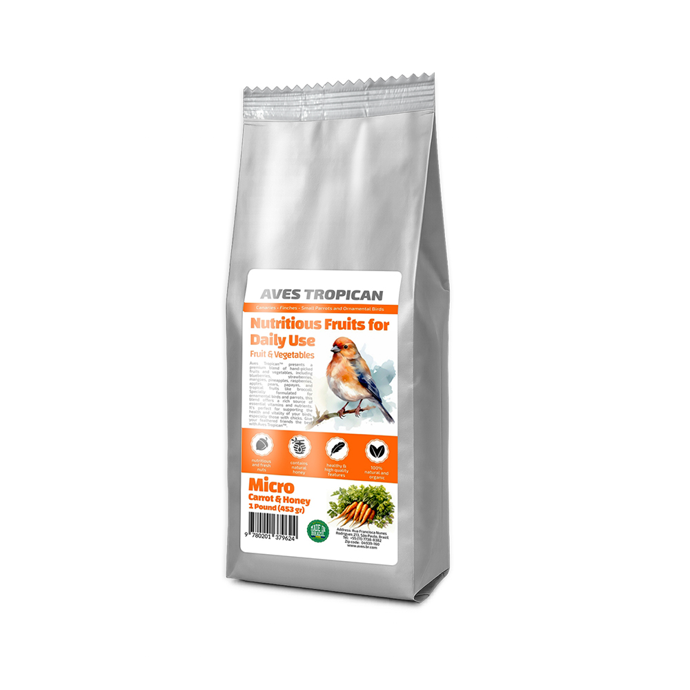 خوراک ویتامینه میکرو هویج عسل دارای ویتامینهای A,B¹ B² B⁶,C,D³,E غنی شده با عسل و سرشار از فیبر و سایر مواد معدنی مورد نیاز پرندگان زینتی کوچک جثه مانند فنچ سانان و قناری سانان و طوطی سانان ریز جثه بخصوص پرندگان مولد و جوجه ها.دارای دان نیجر و رازیانه.بسیار خوشبو و خوش خوراک بدون نگهدارنده و کاملاً ارگانیک.